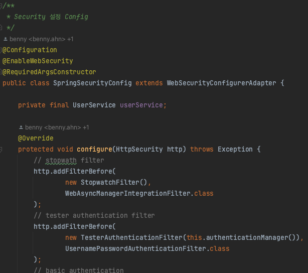 - http.addFilterAfter(<커스텀필터 생성자>, <필터.class>) : 후자 매개변수로 명시한 필터 뒤에 전자 매개변수로 명시한 커스텀 필터가 동작한다.