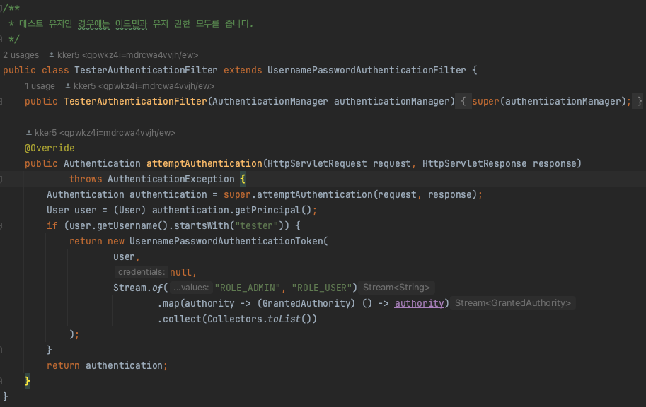 super.attemptAuthentication(request, response)를 통해 Authentication을 받고 Authentication안의 Principal에서 User 정보를 가져온다. username이 tester로 시작하면 USER, ADMIN 권한을 부여한다.