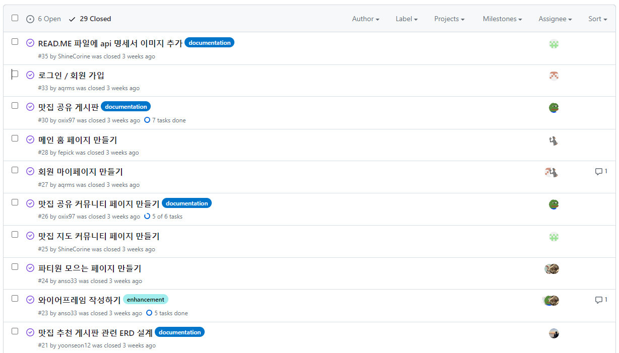 협업 도구는 Github Project를 사용했으며 프로젝트 기획 전, 해야할 일을 issue로 생성하여 어떠한 일을 해야하는지 나열하였습니다.