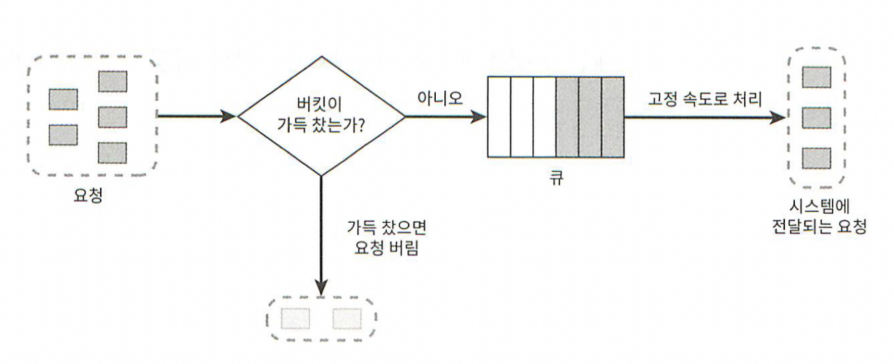 토큰 버킷 알고리즘과 비슷하지만 요청 처리율이 고정되어 있다는 점이 다르다.