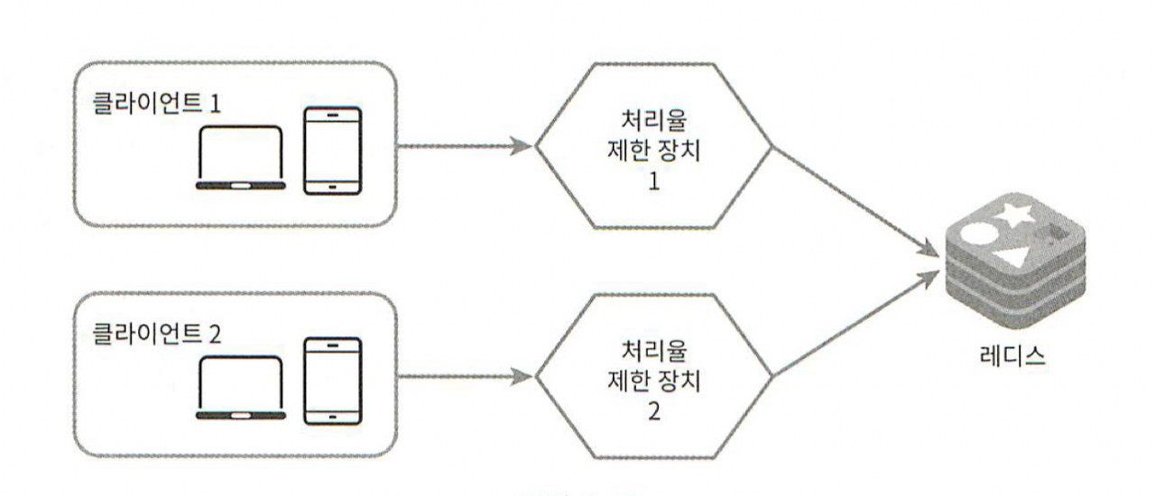 - 설계가 마이크로서비스에 기반하고 있고, 사용자 인증이나 IP 허용목록 관리 등을 처리하기 위해 API 게이트웨이를 이미 설계에 포함시켰다면 처리율 제한 기능 또한 게이트웨이에 포함시켜할 수도 있다.