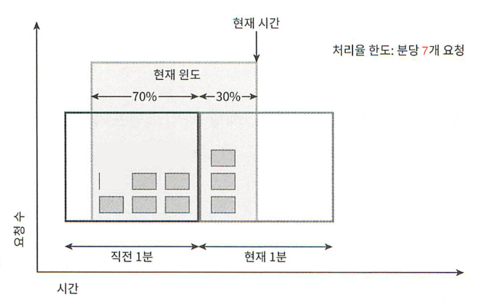 처리율 제한 장치의 한도가 분당 7개의 요청으로 설정되어 있다고 가정하고, 이전 1분 동안의 5개의 요청이, 그리고 현재 1분동안 3개의 요청이 왔다고 가정해본다. 현재 1분의 30% 시점에 도착한 새 요청의 경우, 현재 윈도에 몇 개의 요청이 온 것으로 보고 처리해야할지 계산해보자.