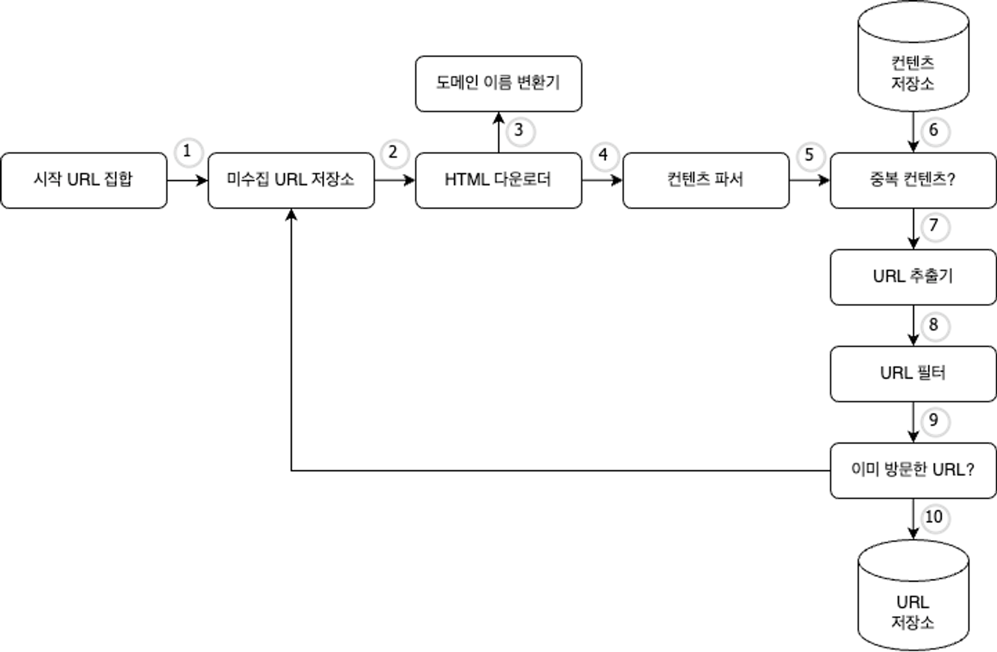 - 확장성(extensibility): 새로운 형태의 콘텐츠를 지원하기가 쉬워야한다. 예를들어 이미지 파일을 크롤링하고 싶다면 이를 위해 전체 시스템을 새로 설계해야한다면 곤란할 것이다.