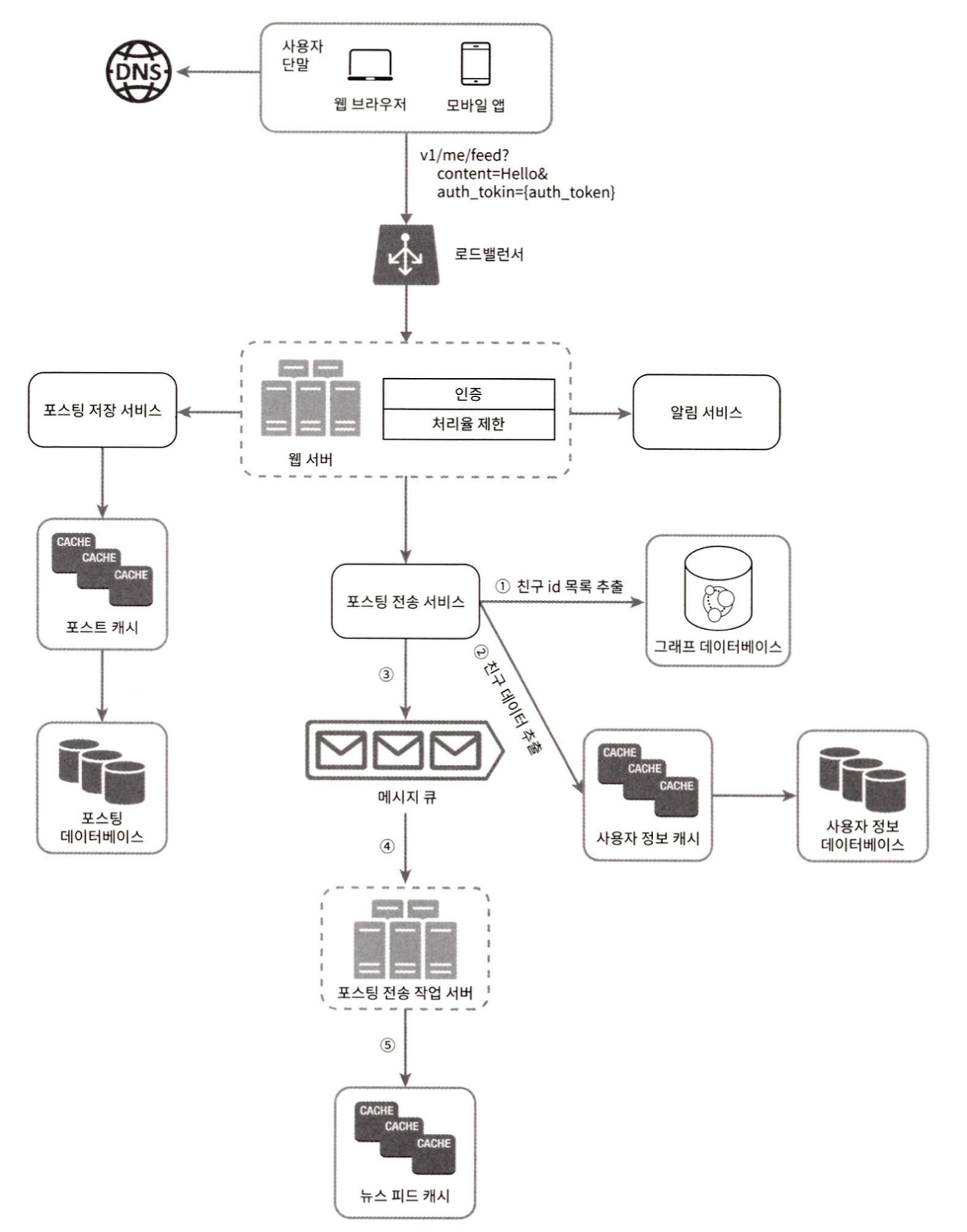 - 포스팅 전송 서비스 : 새 포스팅을 친구의 뉴스 피드에 푸시한다. 뉴스 피드 데이터는 캐시에 보관하여 빠르게 읽어갈 수 있도록 한다.