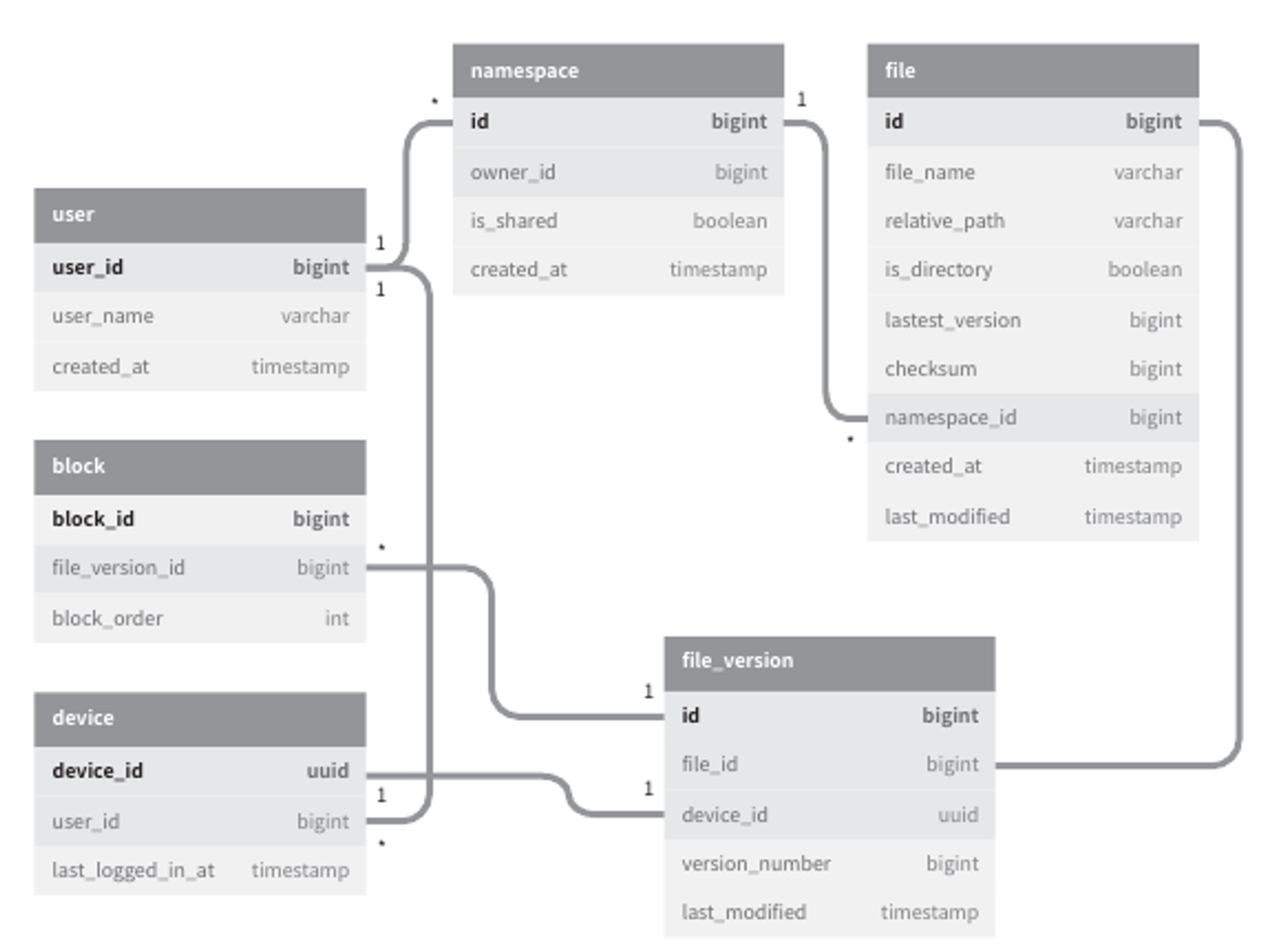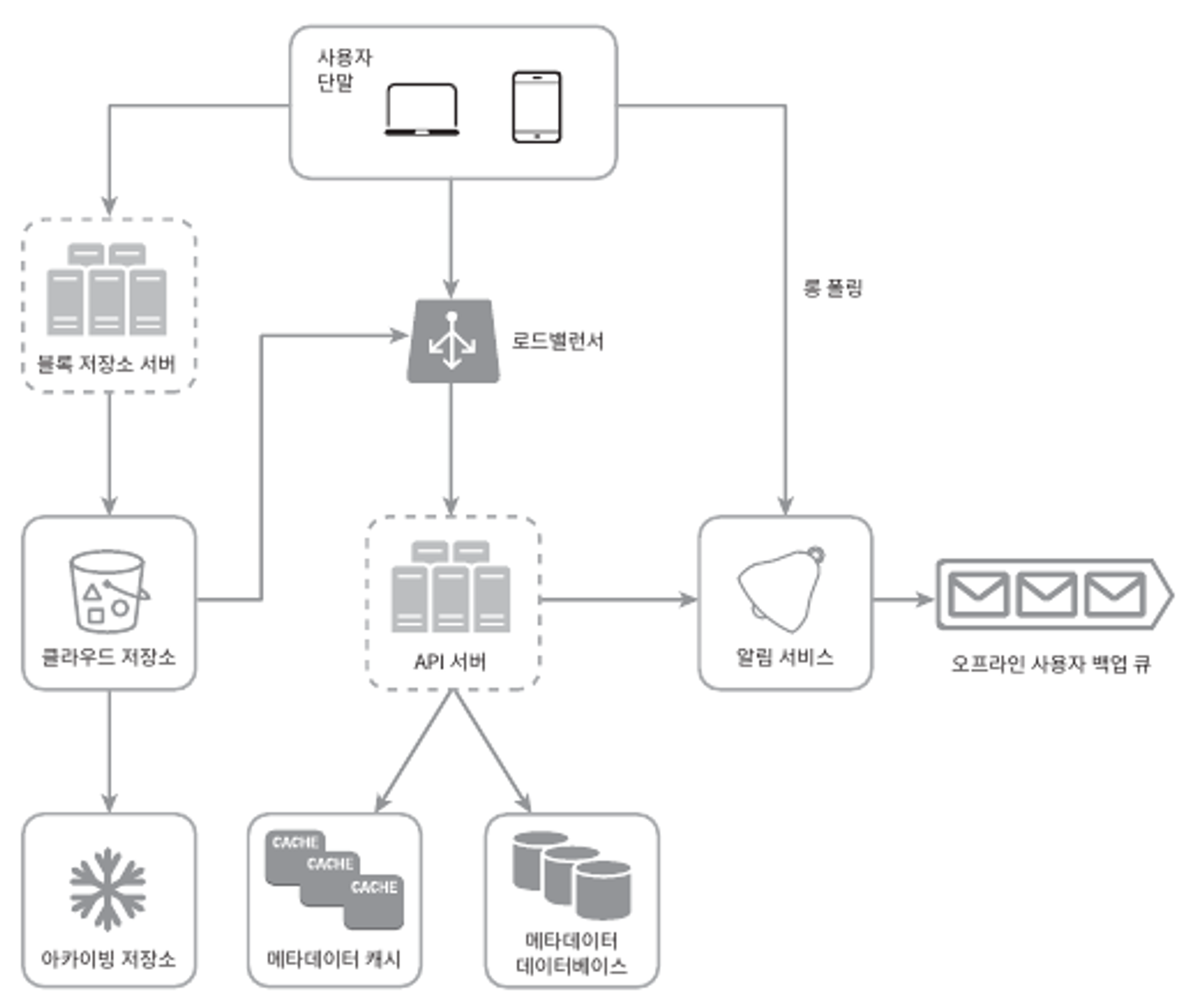 - 메타데이터 데이터베이스 : 사용자, 파일, 블록, 버전 등의 메타데이터 정보를 관리한다. 실제 파일은 클라우드에 저장하며, 이 데이터베이스에는 오직 메타데이터만 저장한다.