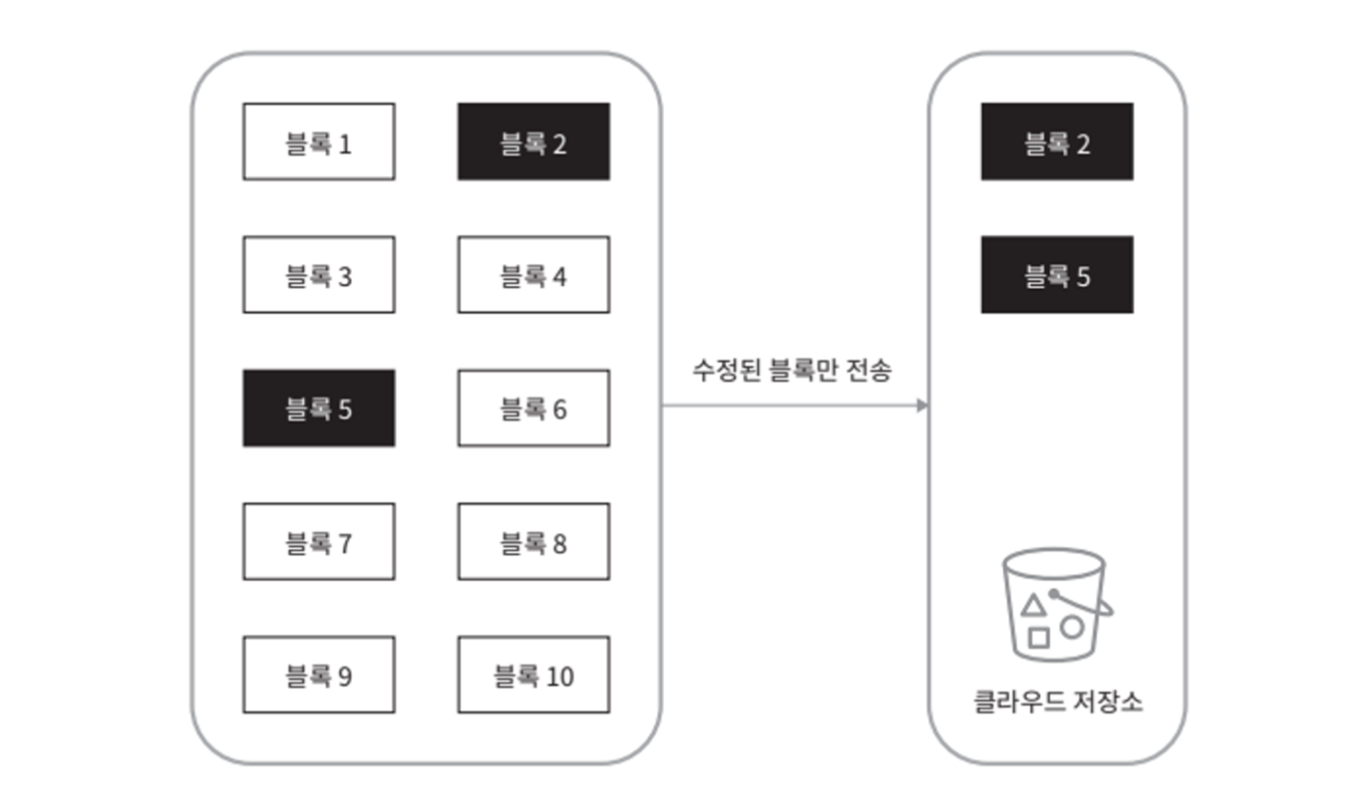 - 전체 파일을 클라우드 저장소로 보내는 대신 수정된 블록만 전송한다.