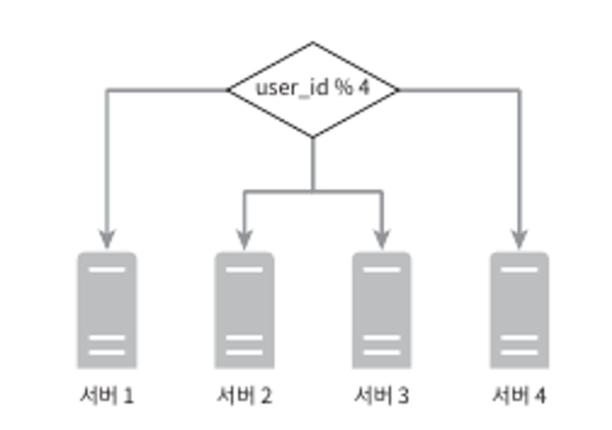 해결책은 데이터를 샤딩하여 여러 서버에 나누어 저장하는 것이다. 다음은 user_id를 기준으로 샤딩한 예제다.