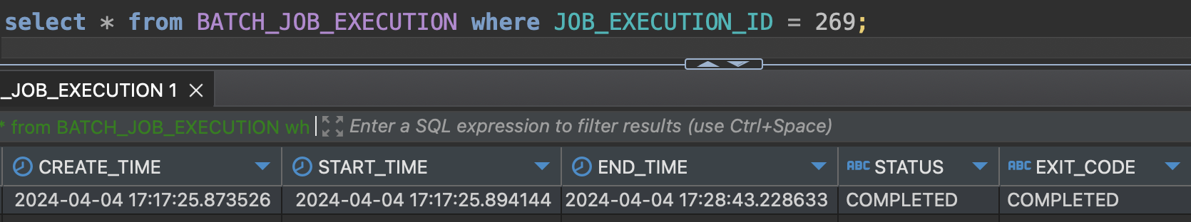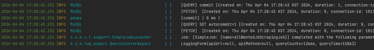 (해당 배치 에서는 일정 개수의 데이터를 스크래핑한 후 Thread.sleep 를 통해 일정 시간 대기한 다음 다시 스크래핑을 진행하는 부분이 포함되어있어 스크래핑 시간이 많이 소요됩니다.)