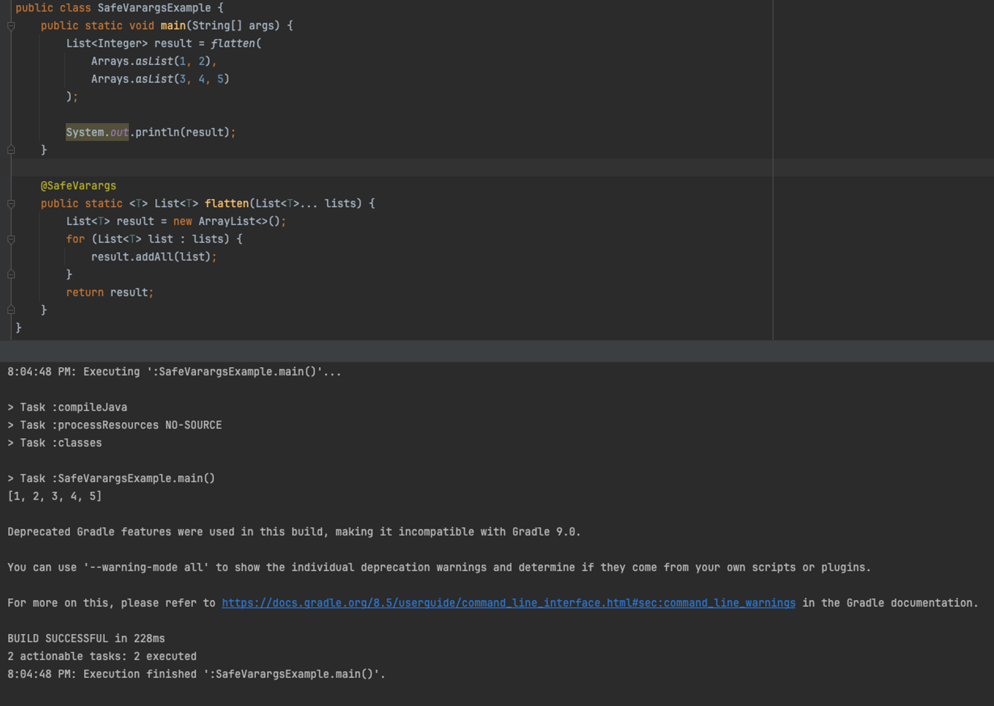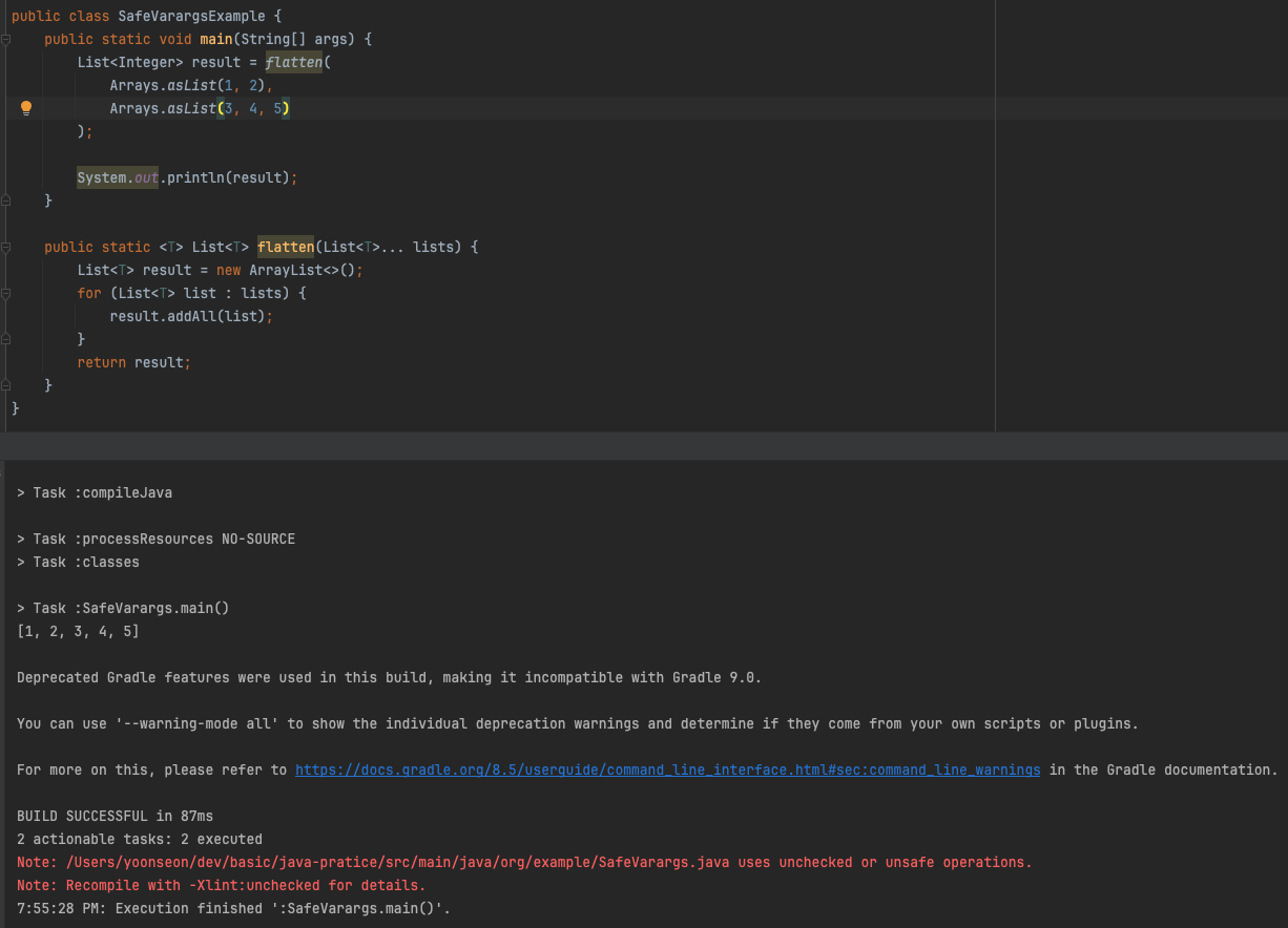 flatten 메서드에서는 타입 파라미터인 T와 가변인자가 함께 사용되었고 겉보기에 문제가 없고 실제로도 정상적으로 실행할 수 있다.