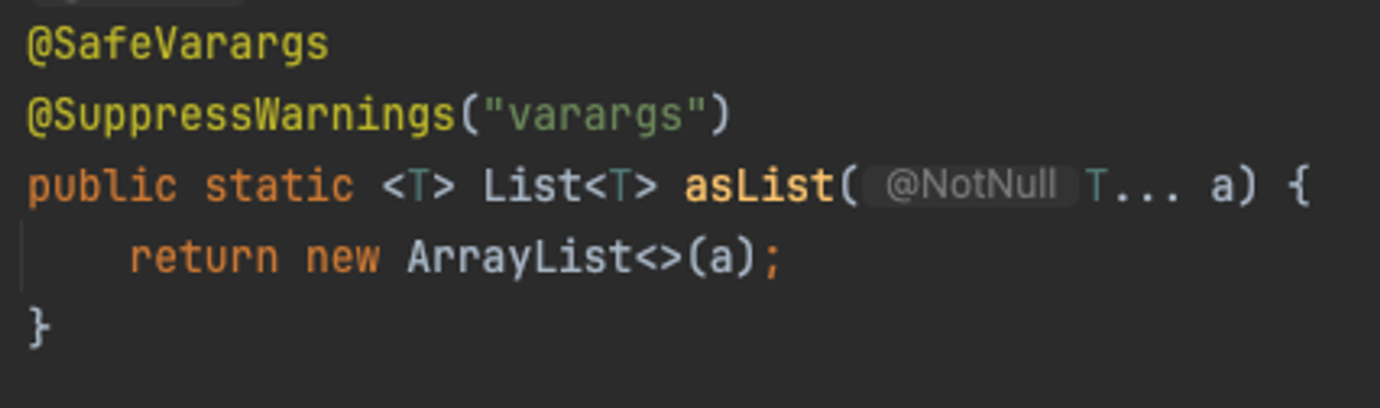 당장 사용했던 Arrays.asList() 내부를 살펴보면 제네릭과 가변인자의 조합이고 실제로 @SafeVarargs 어노테이션이 붙어있다.