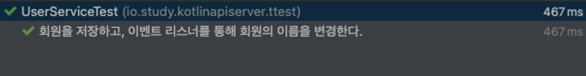 이번에는 위 테스트 코드에서 @TransactionEventListener의 phase 옵션을 BEFORE_COMMIT 으로 변경하고 테스트를 실행해 보겠습니다.
