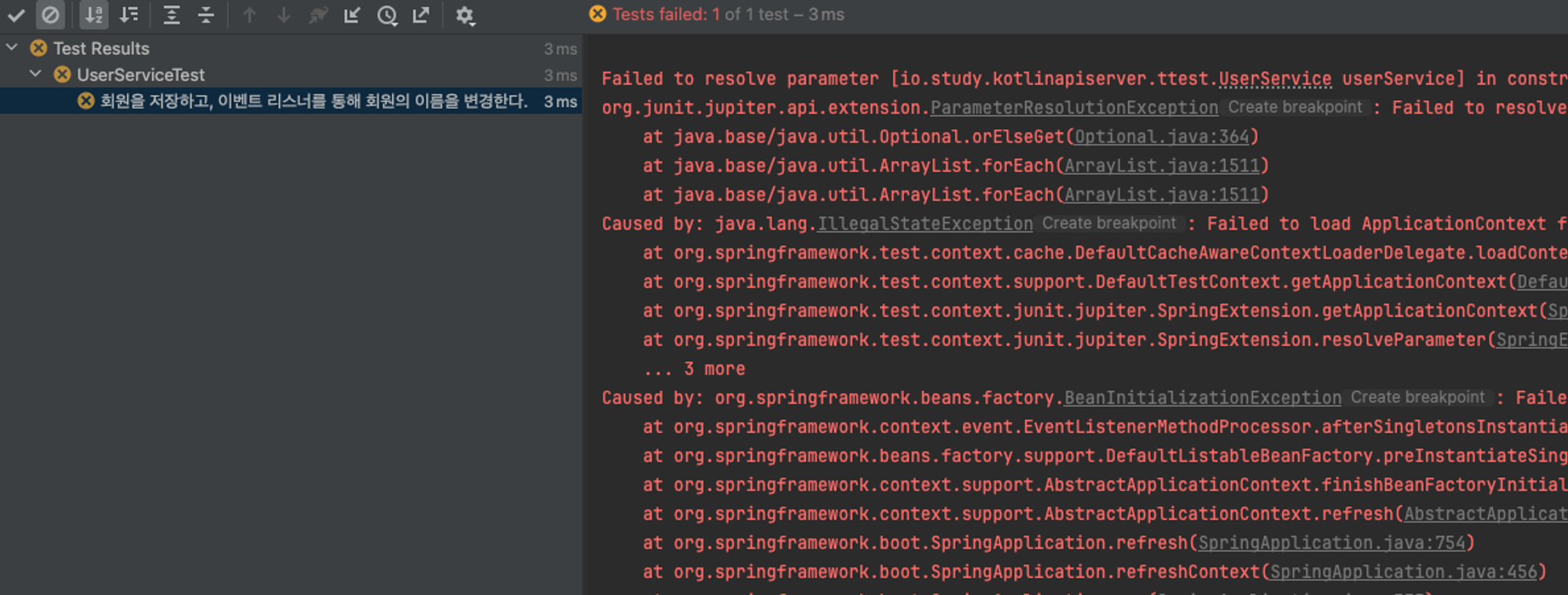 하지만 예상과는 다르게 테스트가 실패합니다.