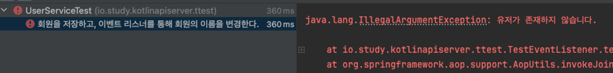 테스트 실패 원인은 메인 트랜잭션이 commit 되기 이전에 @TransactionalEventListener가 실행되었기 때문에 이벤트 리스너의 트랜잭션에서는 아직 DB에 반영되지 않은 해당 유저를 찾을 수 없는 것입니다.