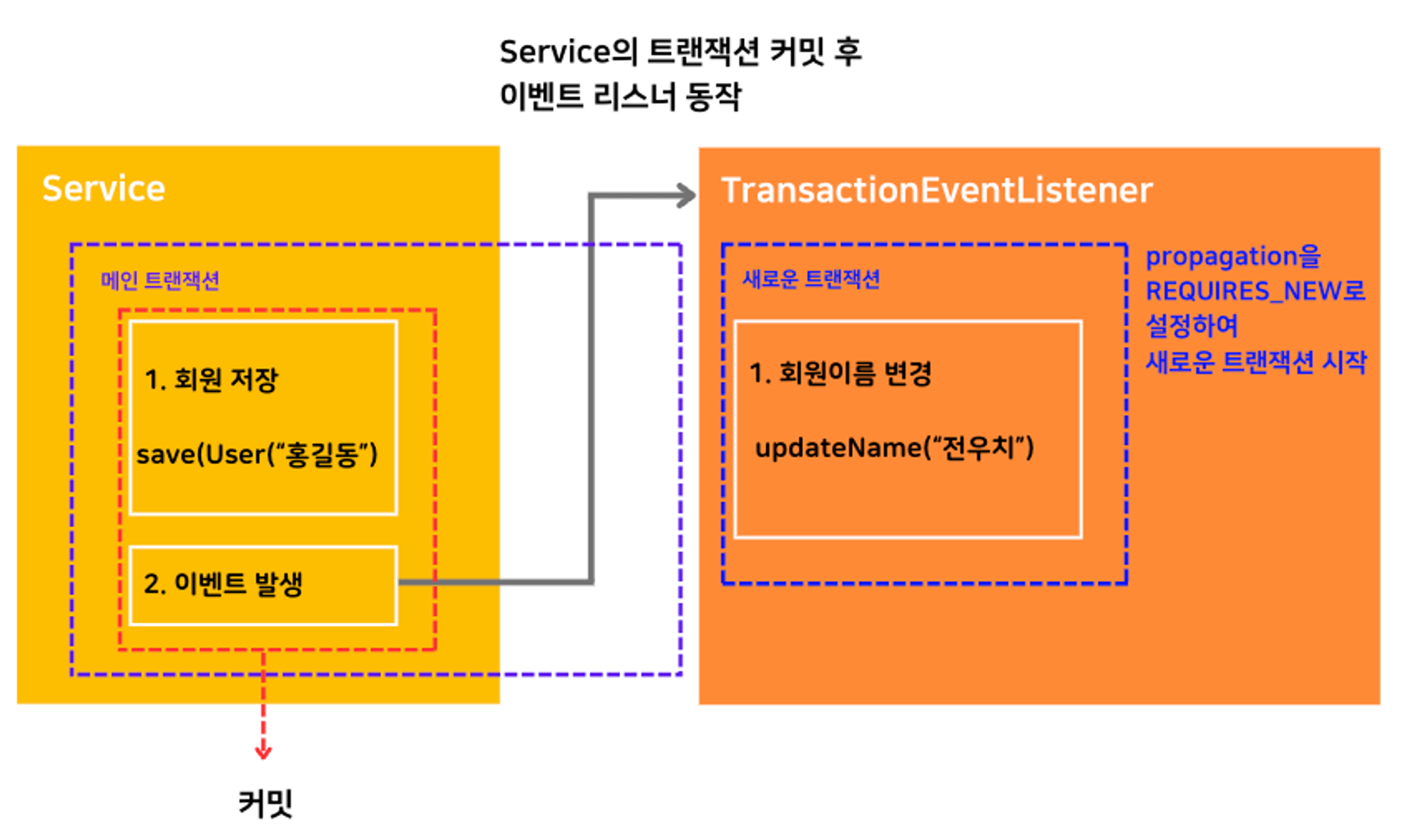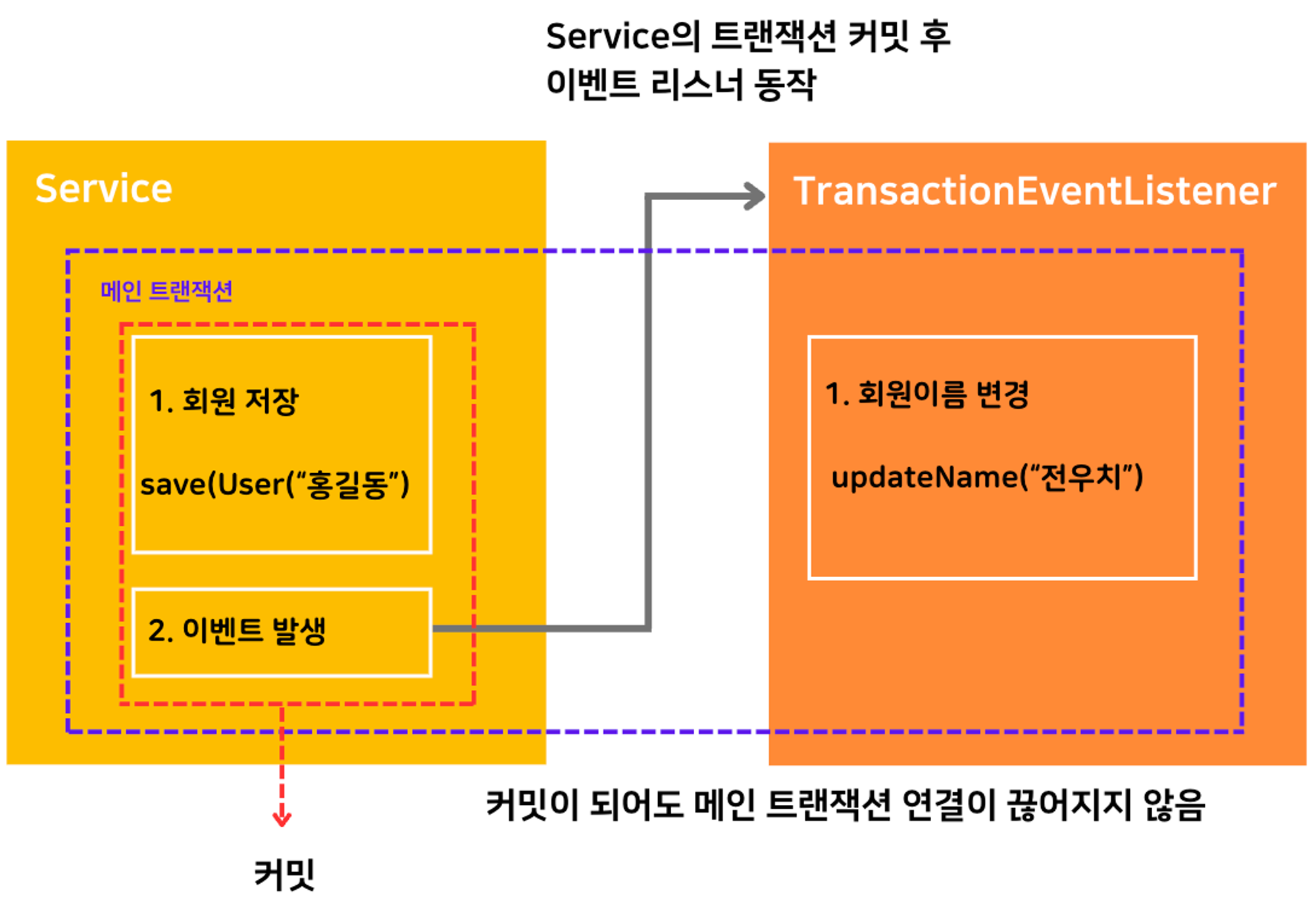 Service에서 메인 트랜잭션을 실행시킨 후 트랜잭션이 커밋되고, 이벤트 리스너에서 작업을 수행하지만,