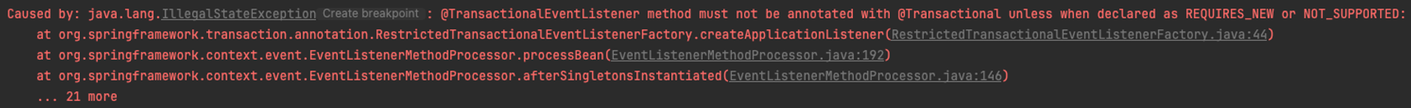 - @TransactionalEventListener는 REQUIRES_NEW 또는 NOT_SUPPORTED로 선언되지 않는 한 @Transactional로 주석을 달아서는 안된다.