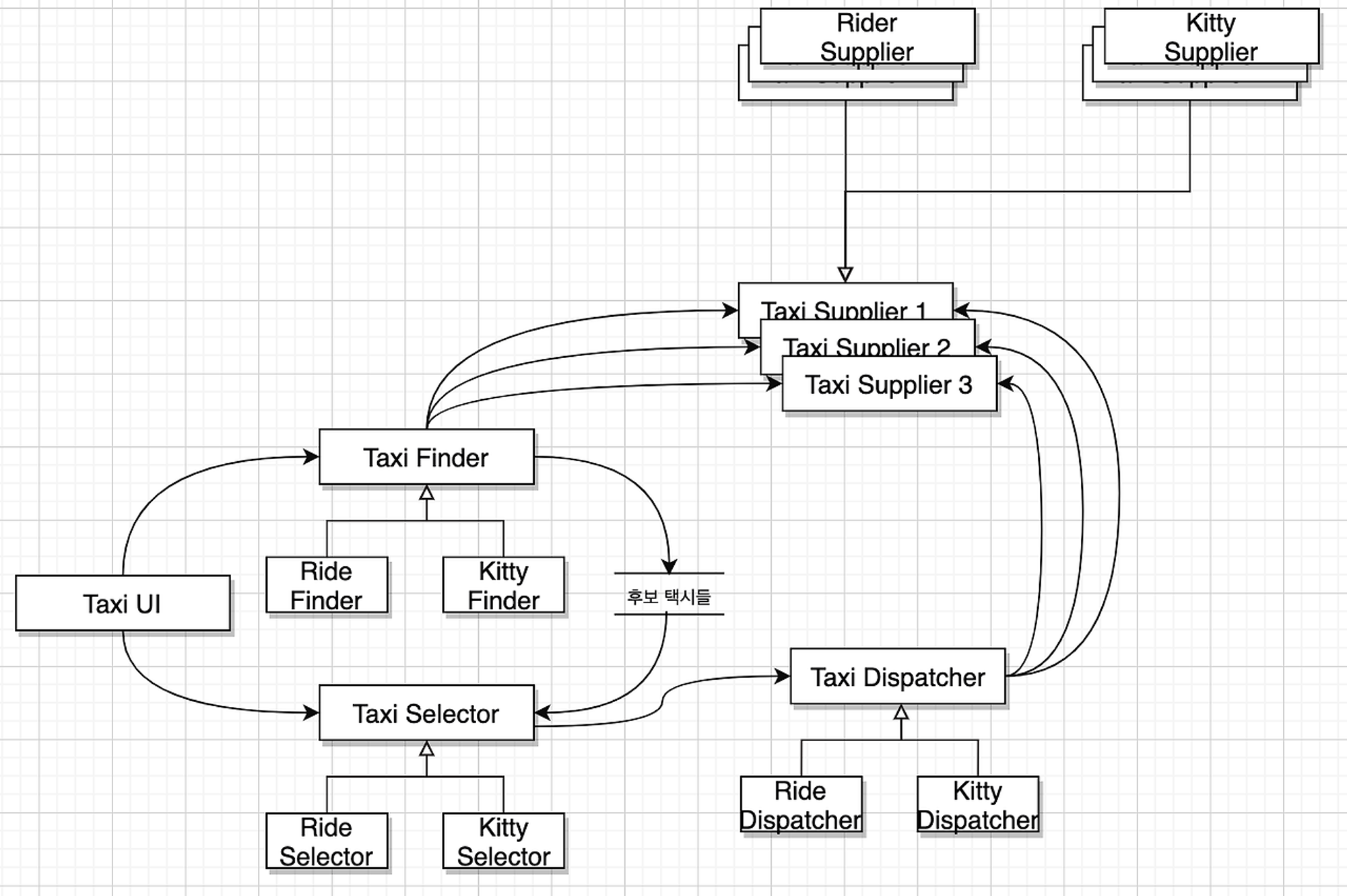 - TaxiFinder 서비스는 여러 TaxiSupplier의 현황을 검토하여 사용자에게 적합한 택시 후보들을 선별함