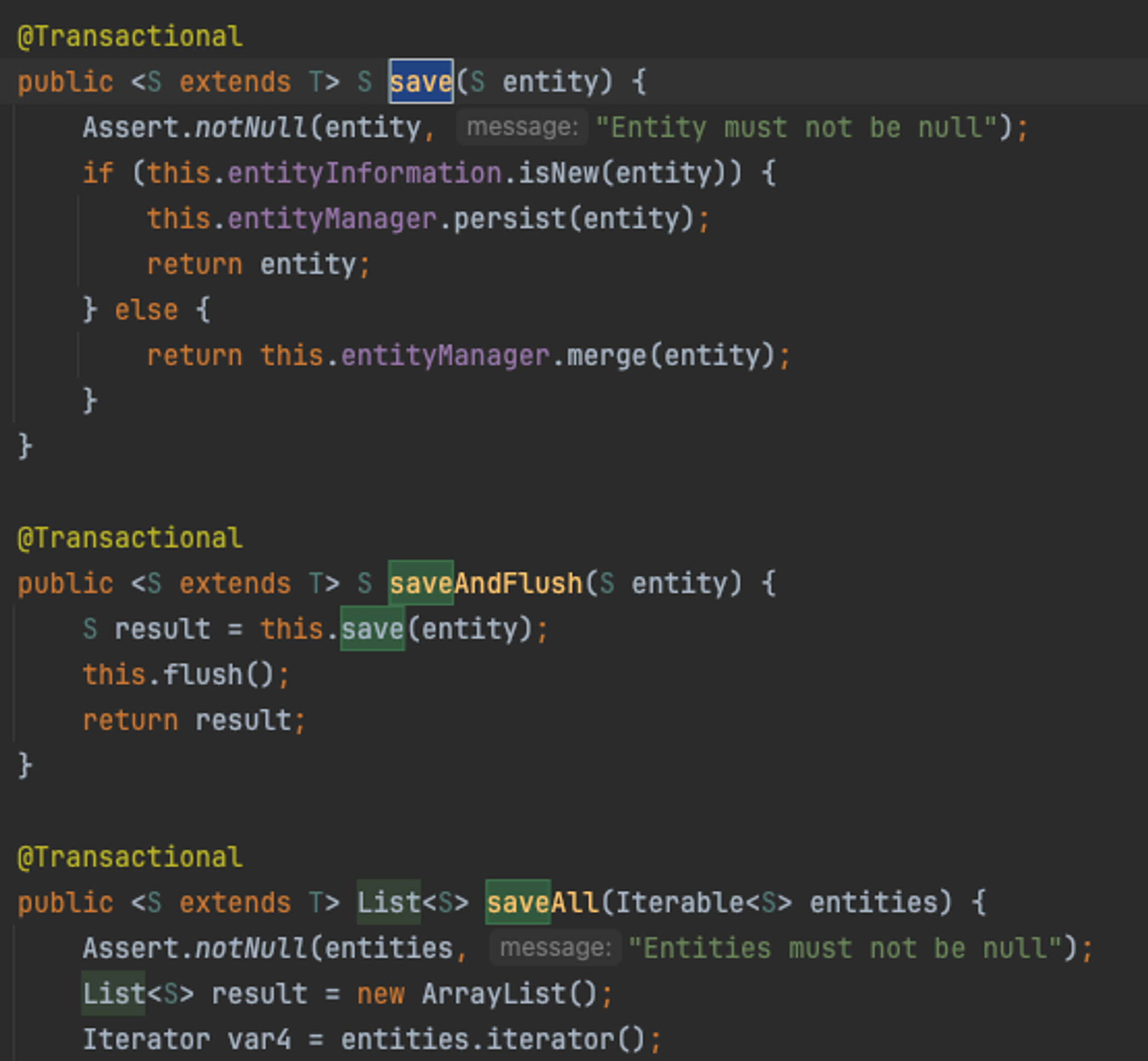 예를 들어 saveAll() 같이 Iterable을 인자로 받는 메서드들은 JPA 스펙상 벌크형으로 데이터가 저장되는 것이 아니라 루프를 돌면서 각각의 row들이 개별적으로 save()를 호출하게 됩니다.