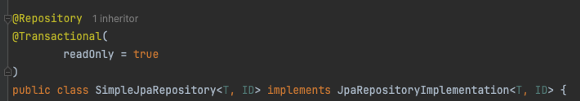 - SimpleJpaRepository 클래스 전역에 @Transactional(readOnly = true)가 설정되어 findById는 읽기 전용으로 동작