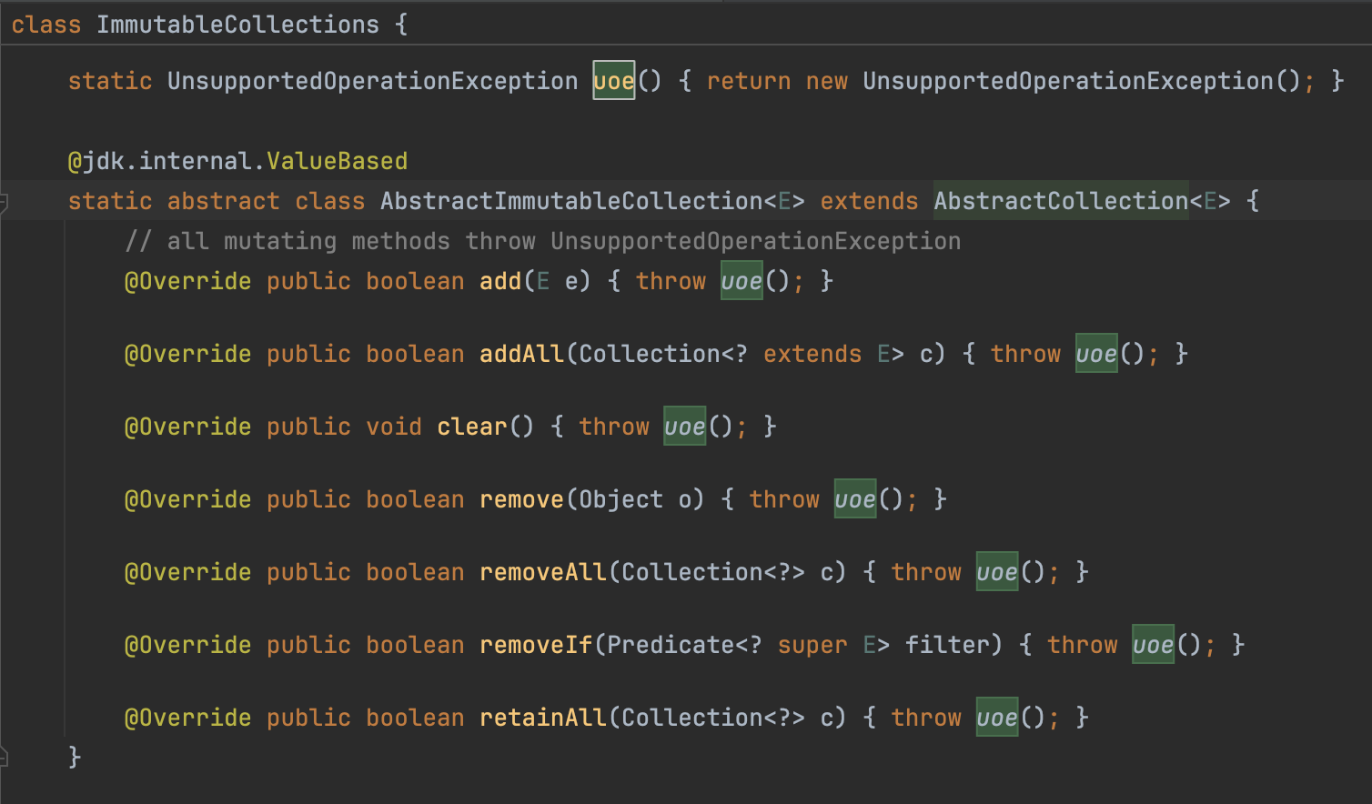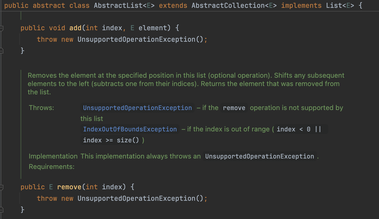 이어서, ImmutableCollections 내부의 또 다른 내부 클래스인 AbstractImmutableList를 살펴보면, 이 클래스는 리스트를 변경하는 모든 메서드를 호출할 때 UnsupportedOperationException을 발생시키도록 구현되어 있습니다.