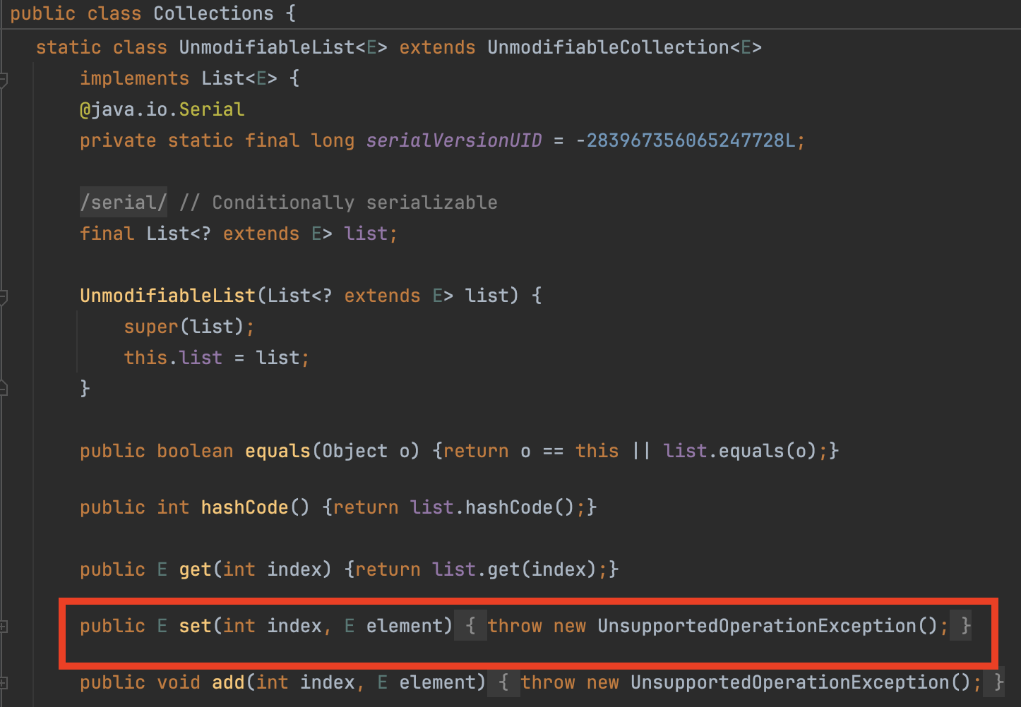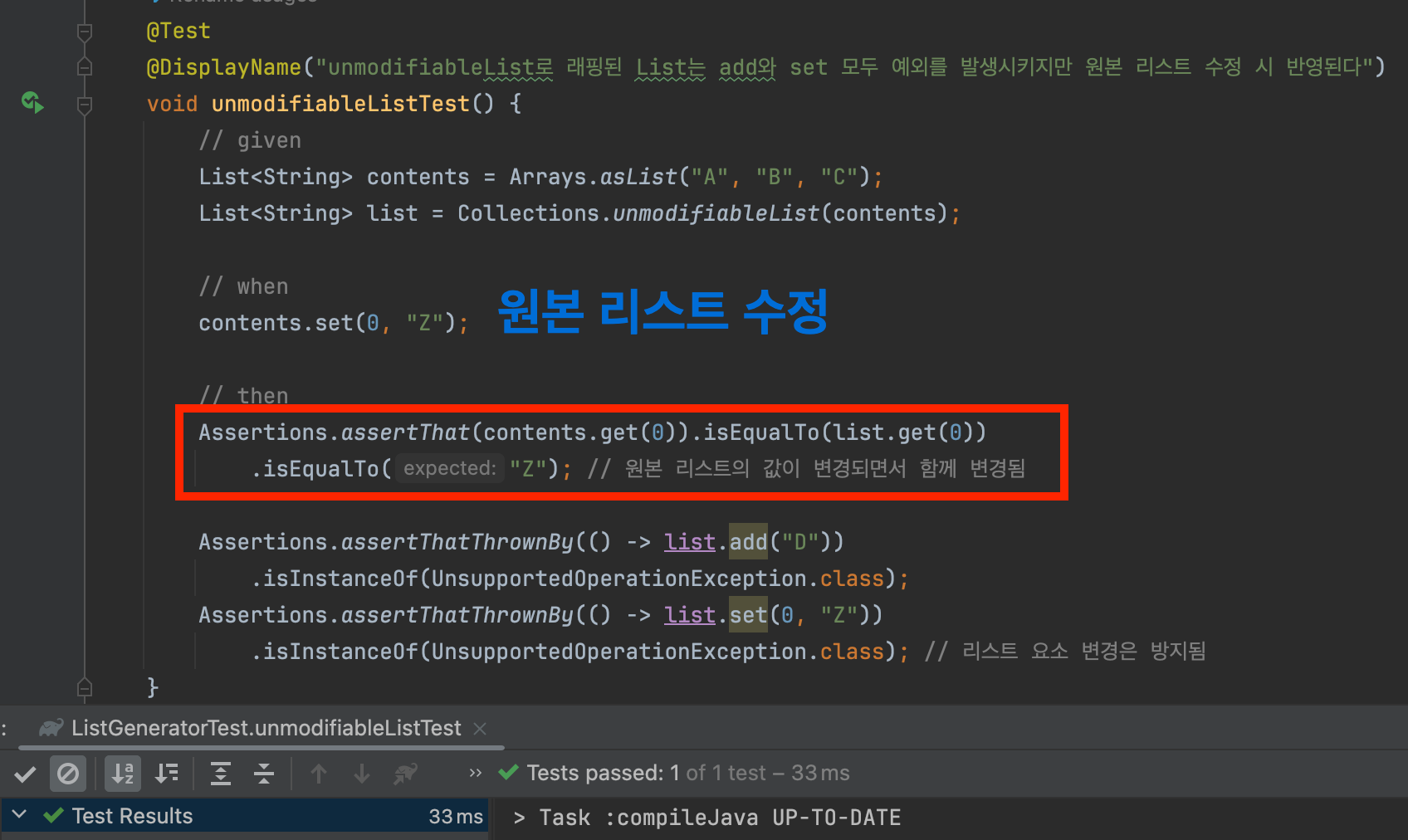 UnmodifiableList는 리스트 요소를 변경하는 set() 메서드 호출 시 UnsupportedOperationException를 반환합니다.