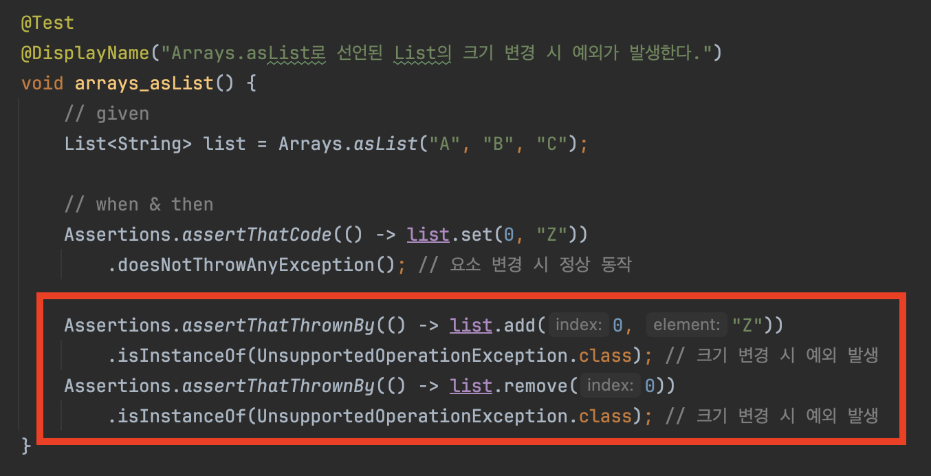 반면, 리스트의 크기를 변경하는 add()와 remove() 등의 메서드는 UnsupportedOperationException을 발생시키는 것을 알 수 있습니다.