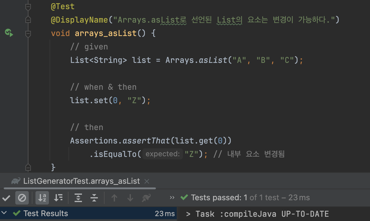 하지만 완벽한 불변을 보장하는 List.of()와 달리 Arrays.asList()는 완벽한 불변을 지원하지 않습니다.