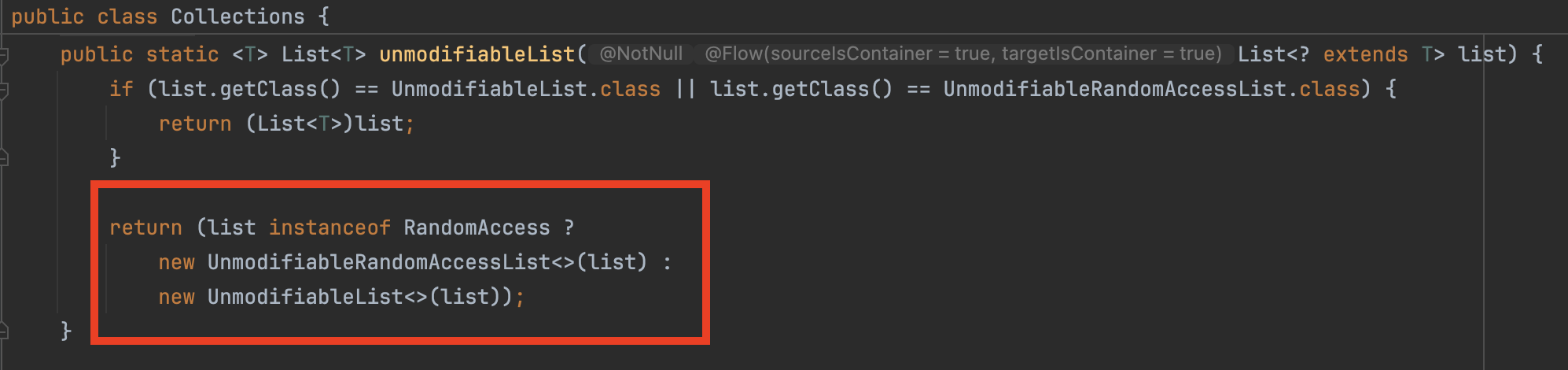 Collections.unmodifiableList()는 UnmodifiableList를 반환하고 있습니다.(UnmodifiableRandomAccessList UnmodifiableList를 상속하고있음)