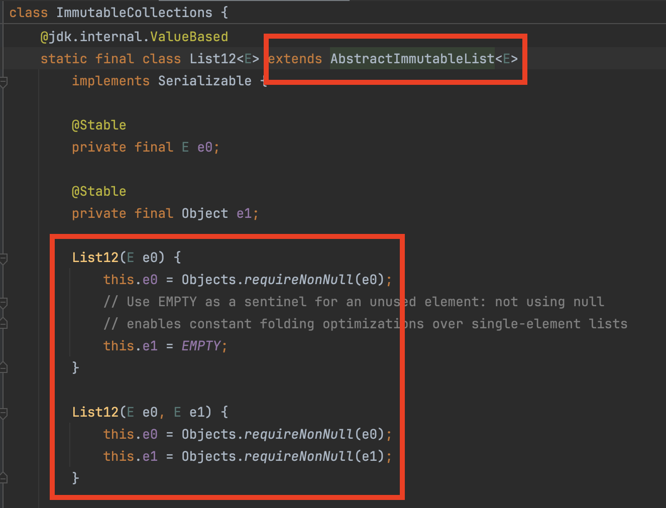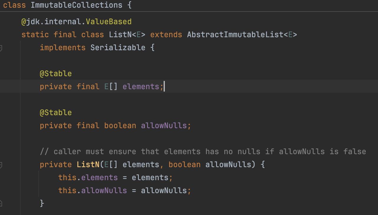 ImmutableCollections 내부의 Inner Class의 생성자를 이용하고 있습니다.