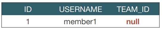 연관관계의 주인인 Member 엔티티에 Team 엔티티를 입력하지 않았기 때문에 MEMBER테이블의 TEAM_ID는 null이 들어간다.