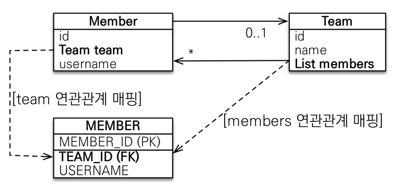 만약 Member가 새로운 팀에 들어가고 싶다면, Member 엔티티의 Team 엔티티를 바꿔야 할지, Team에 있는 Members를 바꿔야 할지 모른다. 하지만 DB입장에서는 객체가 참조를 어떻게 하든 MEMBER 테이블의 외래키인 TEAM_ID값만 바뀌면 된다.