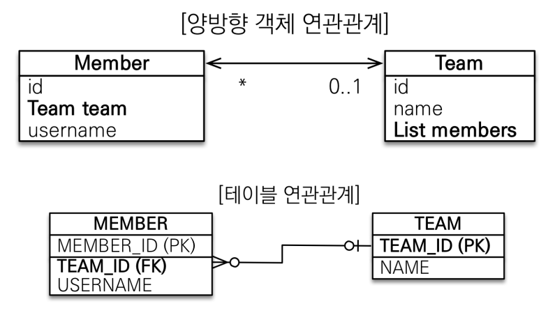 객체의 양방향 관계는 사실 양방향관계가 아니라 서로 다른 단방향 관계 2개이다. 이것을 우리는 억지로 양방향이라고 부르는 것이다.