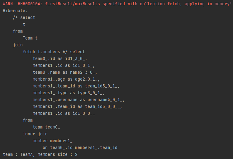 String query = "select t from Team t join fetch t.membersas m";- 페치 조인은 객체 그래프 SQL을 한 번에 조회하는 개념으로 연관된 엔티티를 모두 가져와야 한다.