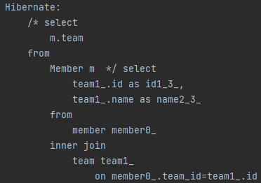 SQL에 Join절을 사용하지 않았지만 Member에서 Team을 찾아야 하기 때문에 Join이 사용된 것을 확인할 수 있다.