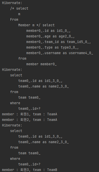 System.out.println("member : "+member.getUsername()+ ", team : "+member.getTeam().getName());