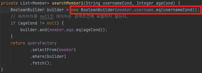 - 다음과 같이 필수 파라미터의 경우 BooleanBuilder를 초기화하면서 추가해 줄 수 있다.