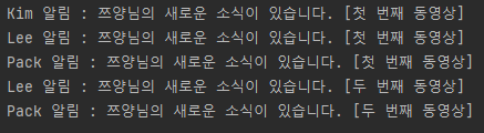 subscribers.forEach(subscriber -> subscriber.alert("쯔양님의 새로운 소식이 있습니다. [" + title + "]"));