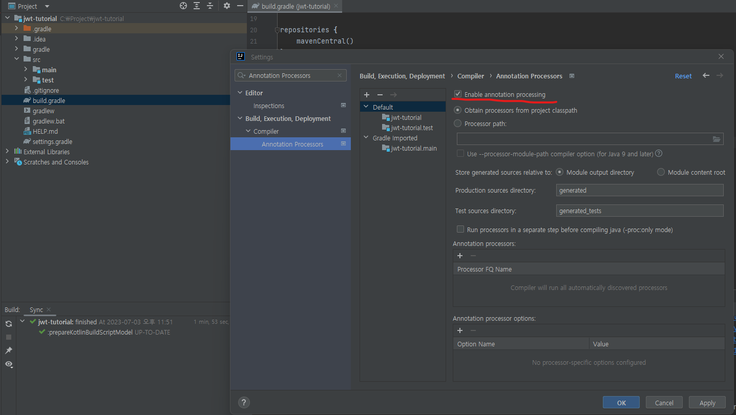 - IntelliJ를 사용한다면 lombok 어노테이션을 사용하기 위해 Enable annotation processing 체크 필요