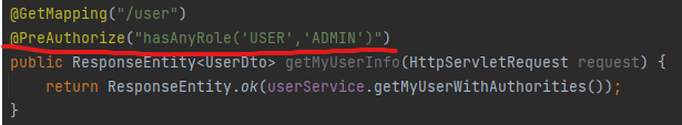 - getMyUserInfo 메서드는 @PreAuthorize를 통해서 USER, ADMIN 두가지 권한 모두 허용했고, getUserInfo 메서드는 ADMIN 권한만 호출할 수 있도록 설정했다.