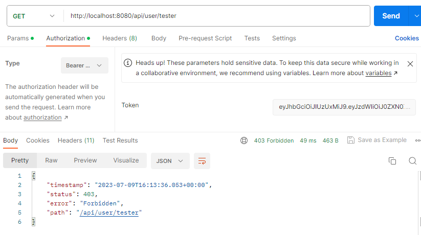 - tester 유저로 발급받은 토큰은 /user/{username} API를 호출하는 권한이 없기때문에 거부된 것을 확인할 수 있다.